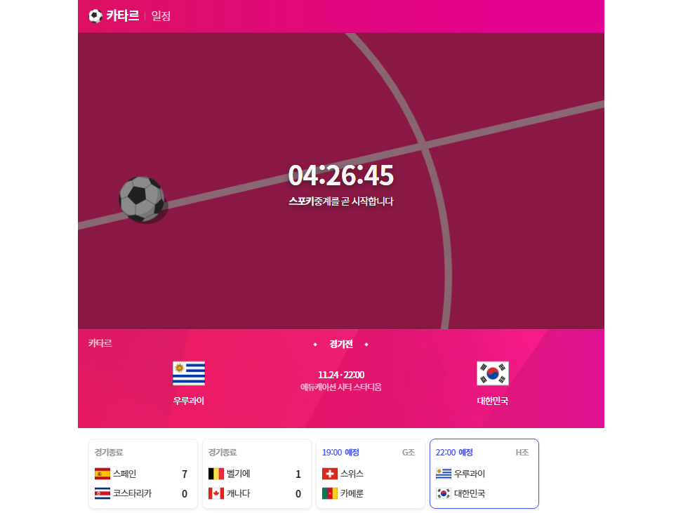이번 우루과이전 시간은 11월 24일 목요일 오후 10시에 진행됩니다. 월드컵이라는 중요성에 의하여 방송사에서는 미리 시작하여 대부분 9쯤에 TV를 통하여 프리뷰를 확인하실 수 있습니다.