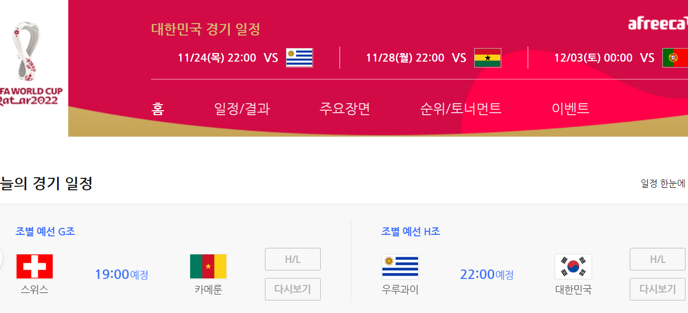 우루과이 vs 대한민국 조별 예선 H조 경기가 22시에 예정되어 있는 것이 확인되구요. 시간에 맞춰 인터넷이나 모바일로 접속을 하시면 축구 중계보기가 가능할 것입니다.