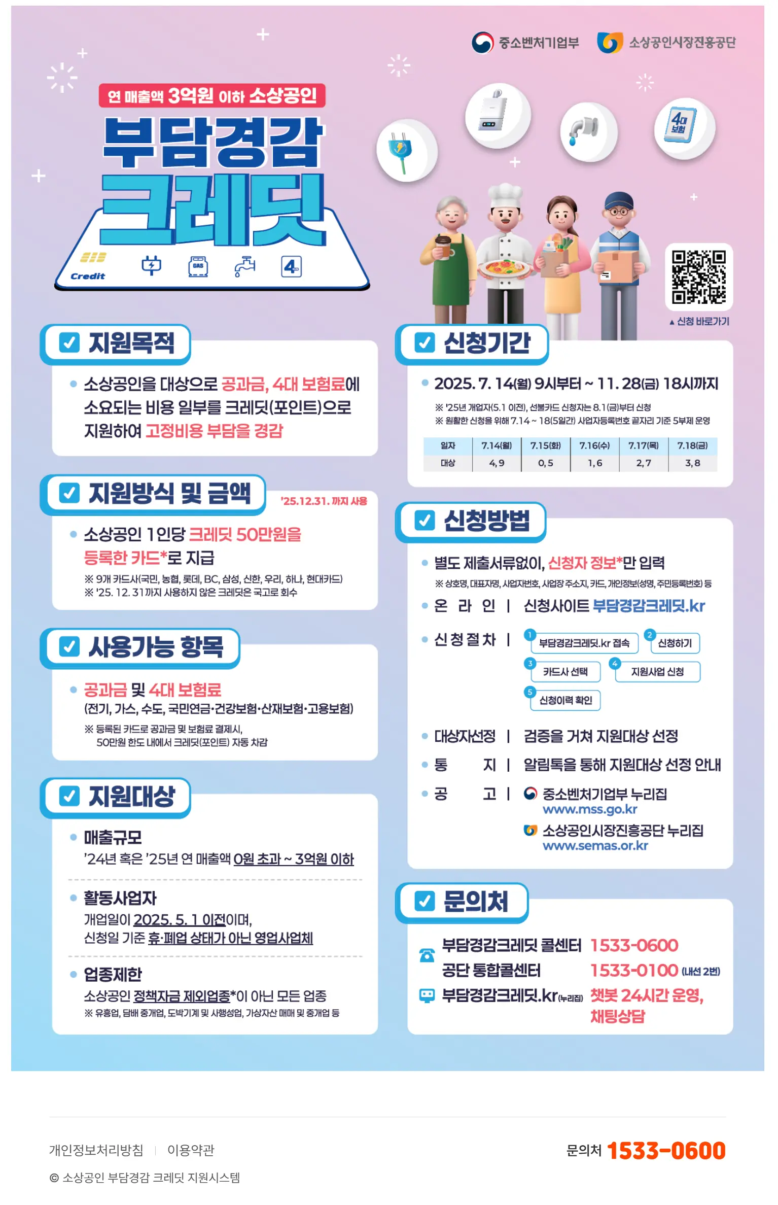 - 문의처: 소상공인 부담경감 크레딧 전용 콜센터 (1533-0600), 소상공인시장진흥공단 통합 콜센터 (1533-0100)