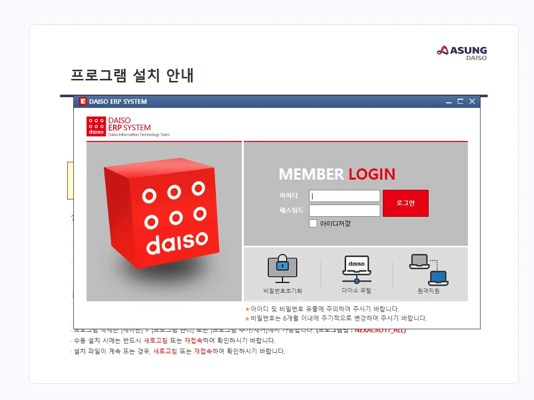 아성다이소에서 사용하는 ERP 시스템입니다. 웹페이지를 통하여 보안프로그램이 설치되면 EPR 시스템을 설치하여 이용하실 수 있습니다.