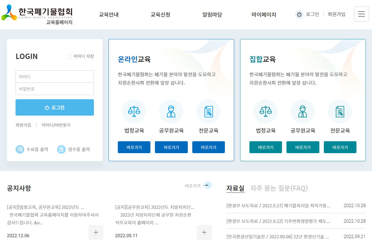 한국폐기물협회에서는 폐기물 분야의 온라인교육과 집합교육을 교육홈페이지를 통해 제공합니다. 법정교육, 공무원교육, 전문교육 등을 확인 후 수강하시면 됩니다.